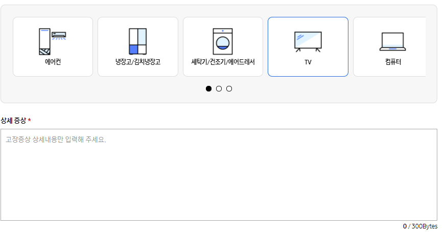 모델명을 선택 후 고장 난 상세 증상을 입력해줍니다. 이때 사진첨부도 가능하며 사진/동영상 첨부 시 방문 엔지니어에게 전달되어 수리에 도움이 될 수 있습니다.