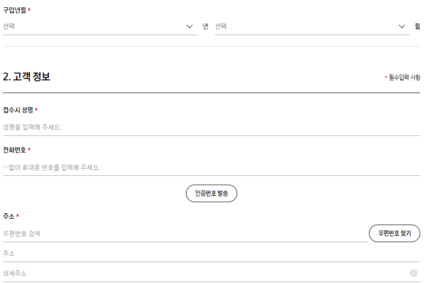 구입 연/월 및 개인정보를 입력 후 예약 가능일 조회하기를 누르시면 예약가능 스케줄이 하단에 표시되고 제시된예약 가능일, 시간 등을 체크 후 예약신청 버튼을 누르면 접수가 완료됩니다.
