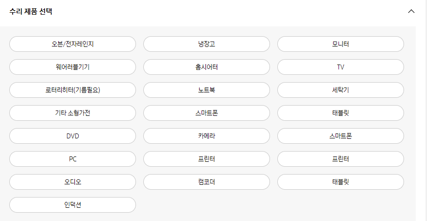 원하는 삼성전자 서비스센터를 찾았으면 서비스센터에서 수리하고자 하는 제품을 선택해주시면 됩니다.