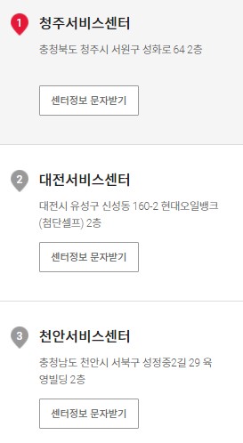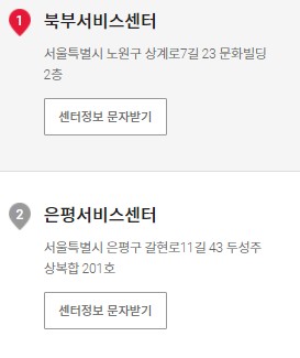 서울지역은 북부서비스센터, 강남서비스센터, 은평서비스센터, 남부서비스센터 총 4개의 서비스센터가 있습니다. 자세한 주소는 위 사진에서 확인해주세요.