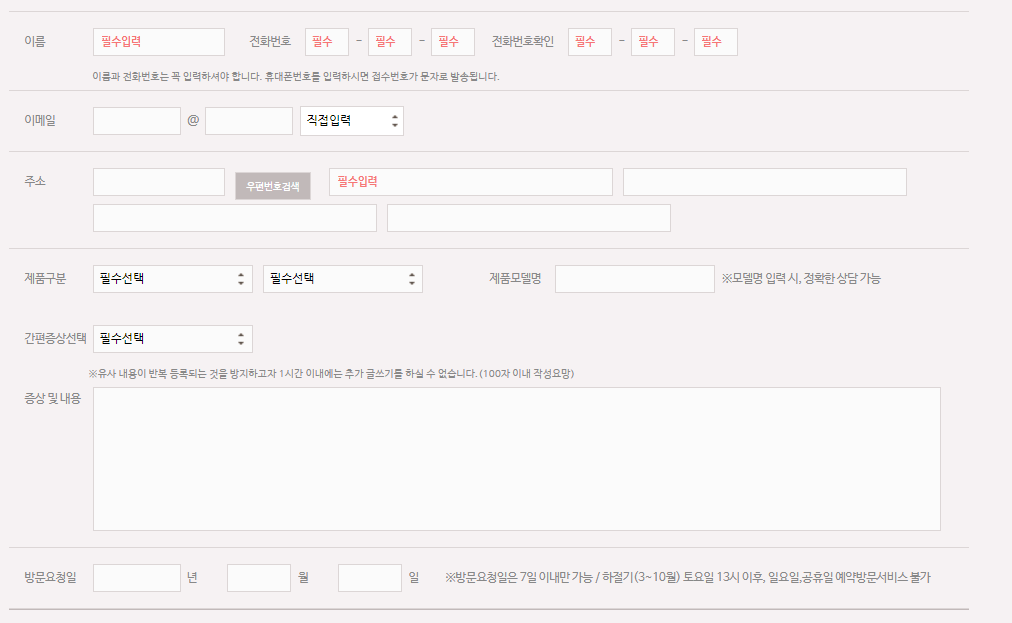 - 주말 및 공휴일 접수건은 평일 담당 엔지니어가 순차적으로 연락 후 방문하니 참고바랍니다.