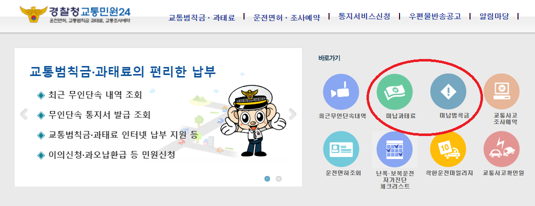 경찰청 교통민원 24 사이트에서는 교통범칙금 조회 외에도 과태료 조회 납부시스템, 기납부 내역, 무인단속, 착한 운전 마일리지 등 다양한 교통과 관련된 정보를 조회하실 수 있습니다.