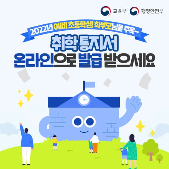 지금 가지는 읍, 면, 동 주민센터에서 우편 또는 인편으로 초등학교 취학통지서를 세대주에게 배부해왔었으나 2022년부터 모든 초등학교 취학통지서를 온라인으로 확인하고 발급받을 수 있게 되었습니다.