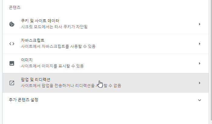 여기까지는 동일하며 팝업 및 리디렉션 항목에서 가장 아래로 내리시면 아래와 같은 항목을 확인하실 수 있습니다.