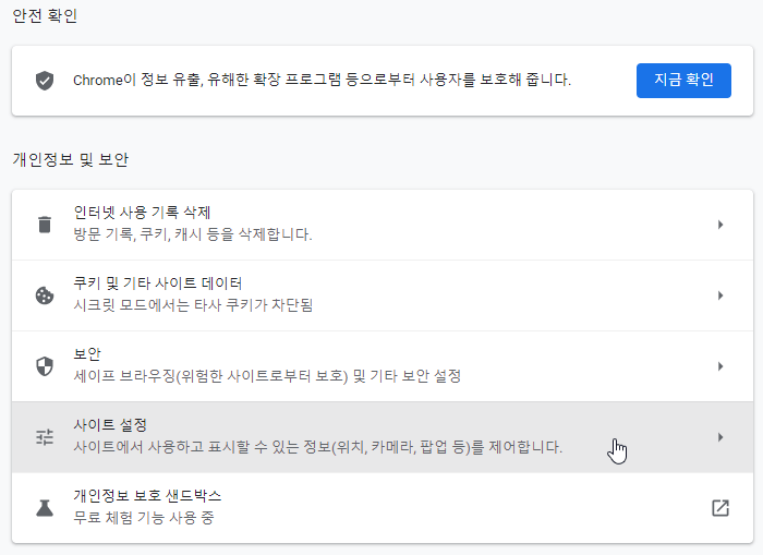 3. 개인정보보안 항목 중 사이트 설정을 클릭합니다.